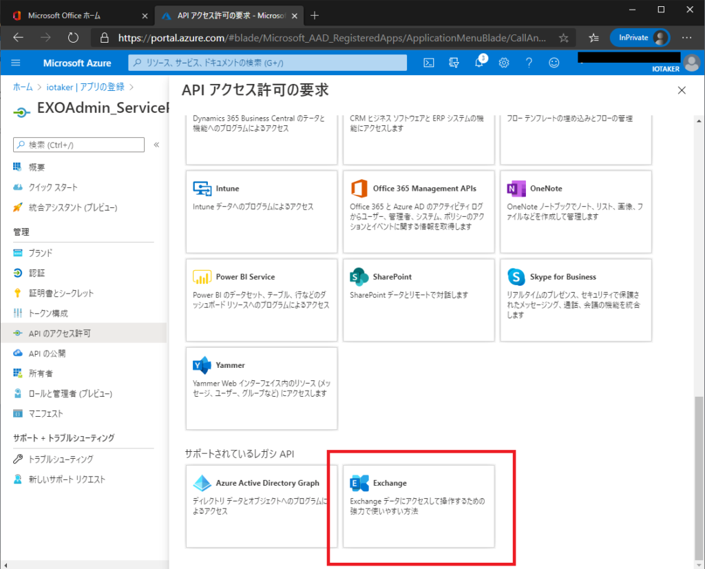 「所属する組織で試用しているAPI」の一覧から「Office 365 Exchange Online」を探して選択します。